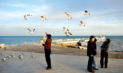 在青海湖與鳥(niǎo)類(lèi)親密接觸。(官群 攝)