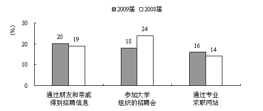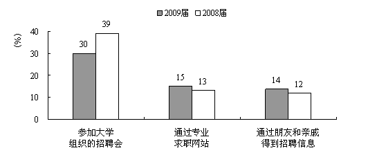 3-3-2 2009屆與2008屆“211”院校畢業(yè)生初次求職成功的渠道分布前3位對比